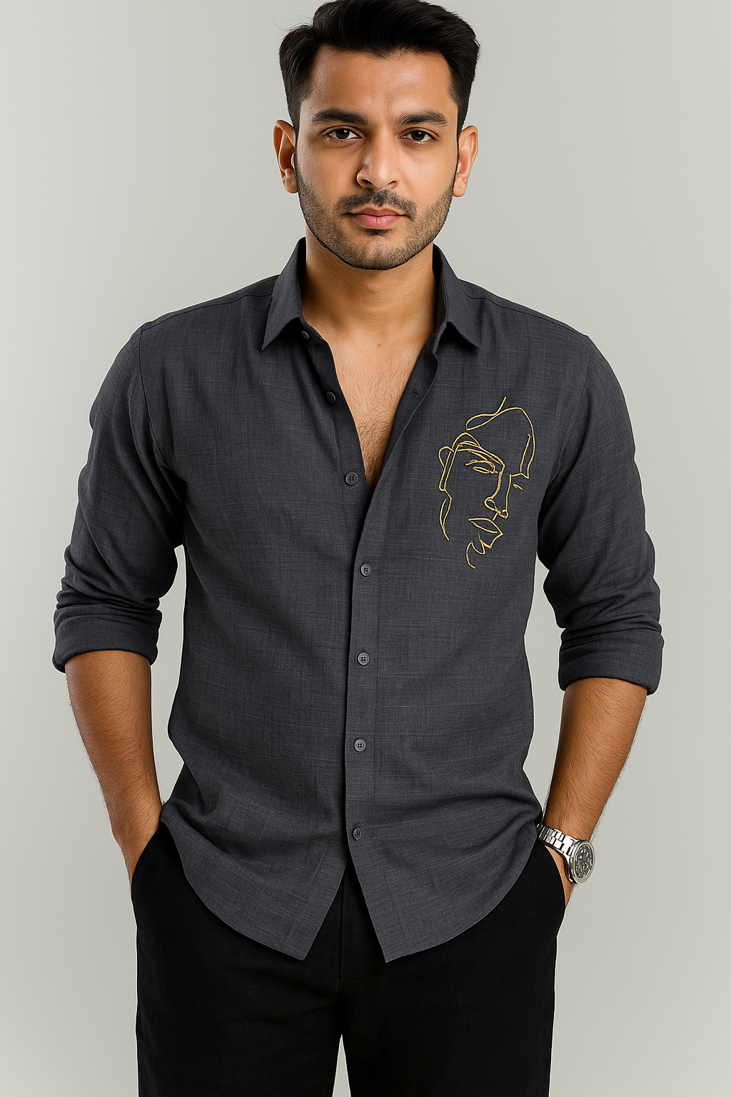 A signature abstract face embroidery in tonal threads adds a refined artistic touch, making it the perfect blend of contemporary art and timeless tailoring. Designed for the modern man, the shirt features a relaxed yet sharp silhouette, rolled-up sleeves, and an open-collar look that transitions seamlessly from daywear to evening elegance.