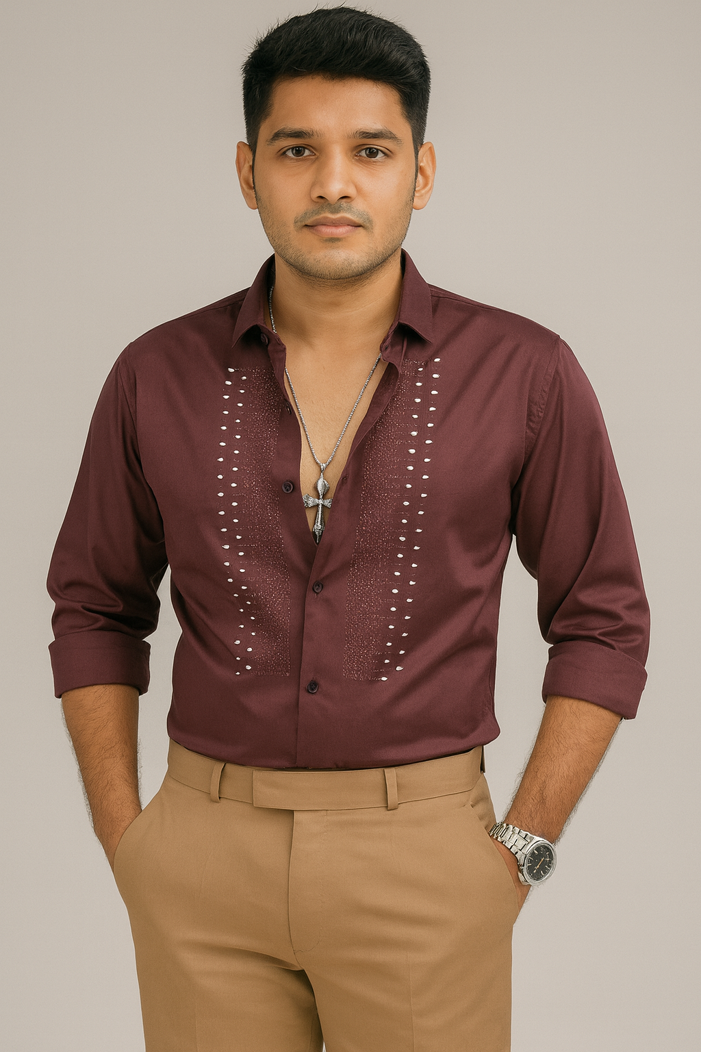 Elevate your evening style with our luxury embellished shirts, designed for the modern man who appreciates refined detail and effortless confidence. Crafted from premium satin-finish cotton, each shirt features precision-set crystal embellishments along the placket, adding a subtle yet striking sparkle.