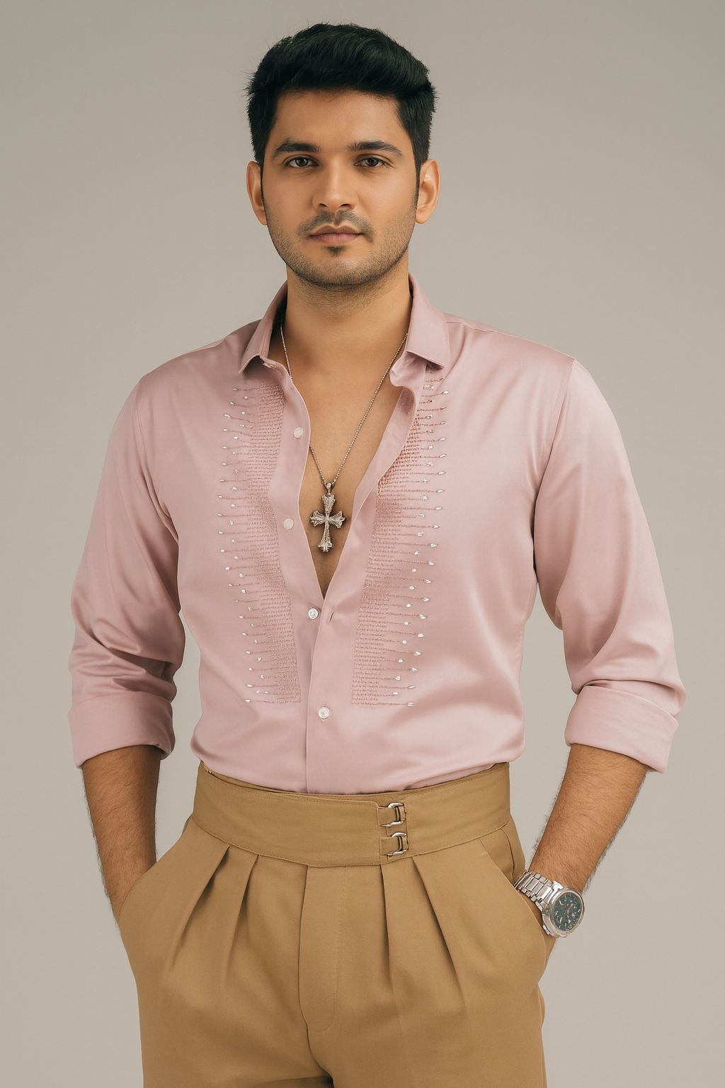 Elevate your evening style with our luxury embellished shirts, designed for the modern man who appreciates refined detail and effortless confidence. Crafted from premium satin-finish cotton, each shirt features precision-set crystal embellishments along the placket, adding a subtle yet striking sparkle.