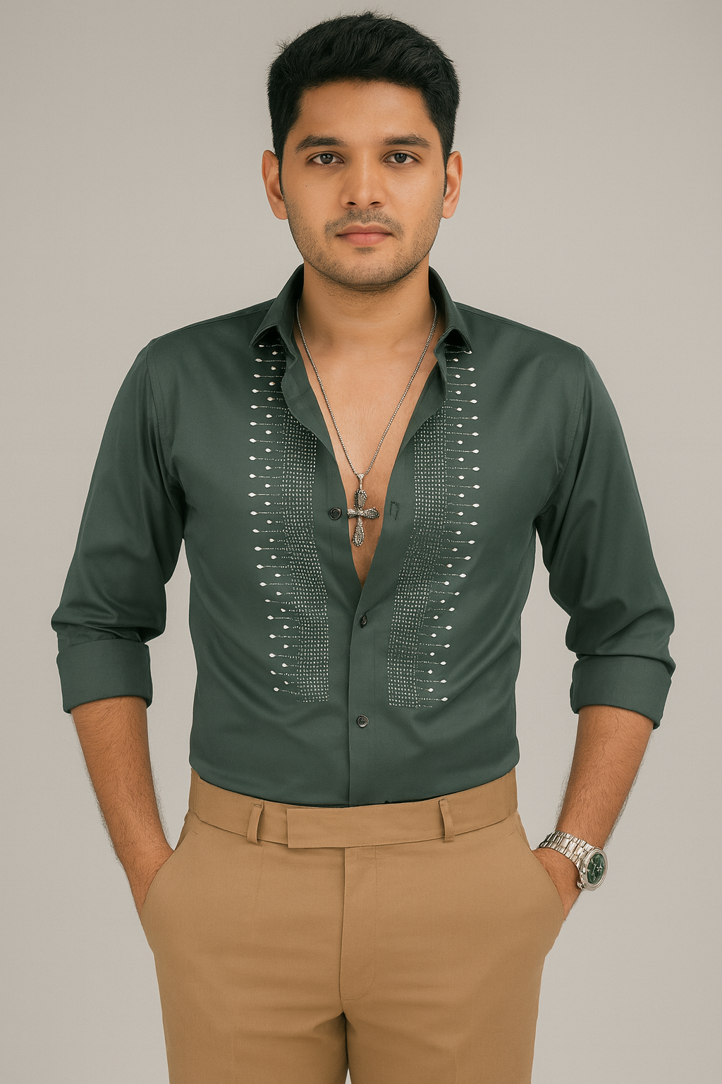Elevate your evening style with our luxury embellished shirts, designed for the modern man who appreciates refined detail and effortless confidence. Crafted from premium satin-finish cotton, each shirt features precision-set crystal embellishments along the placket, adding a subtle yet striking sparkle.