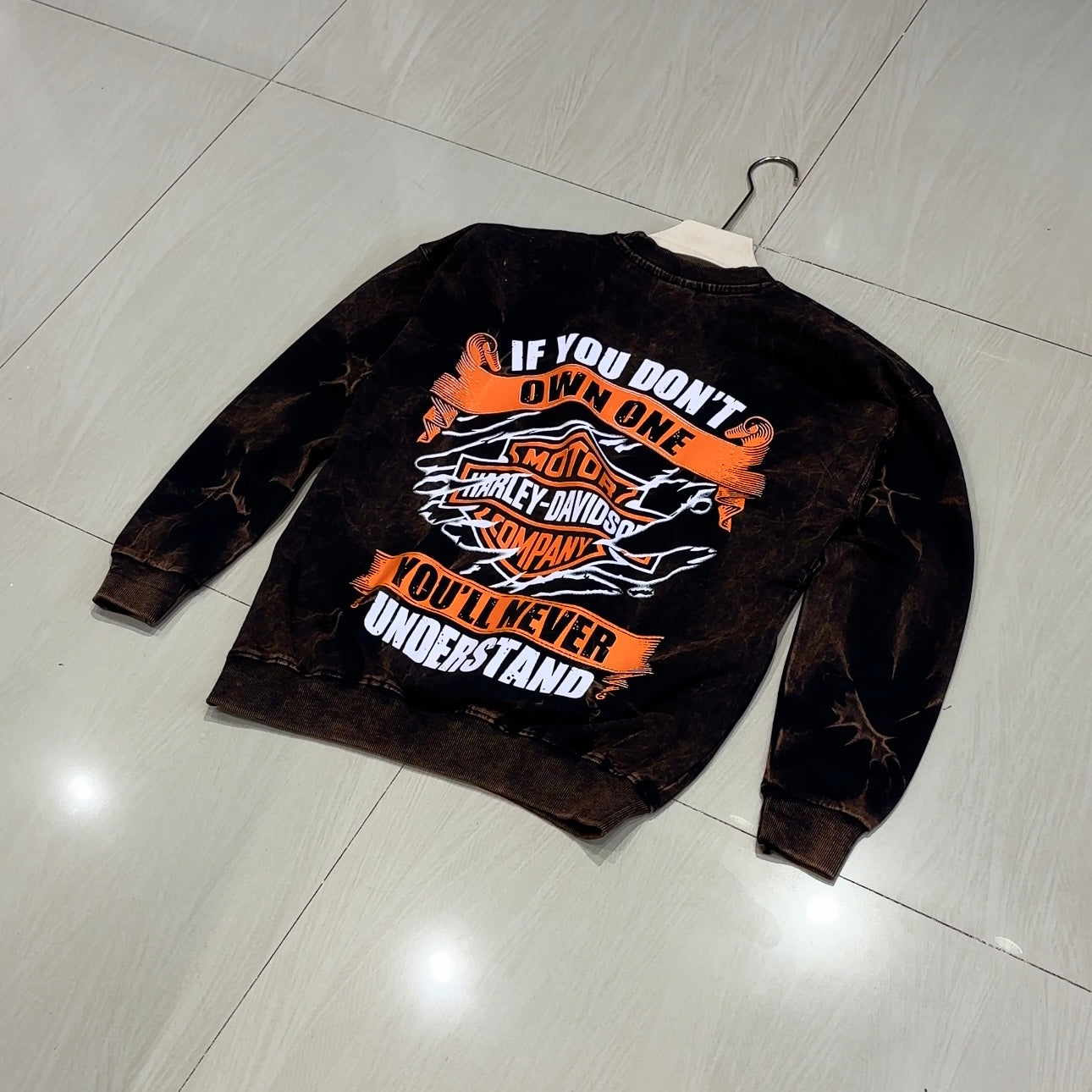 Street-ready and effortlessly cool. Premium cotton loop knit, oversized fit, acid wash finish with minimal front print and bold motorbike graphic at the back. Comfort meets edge.