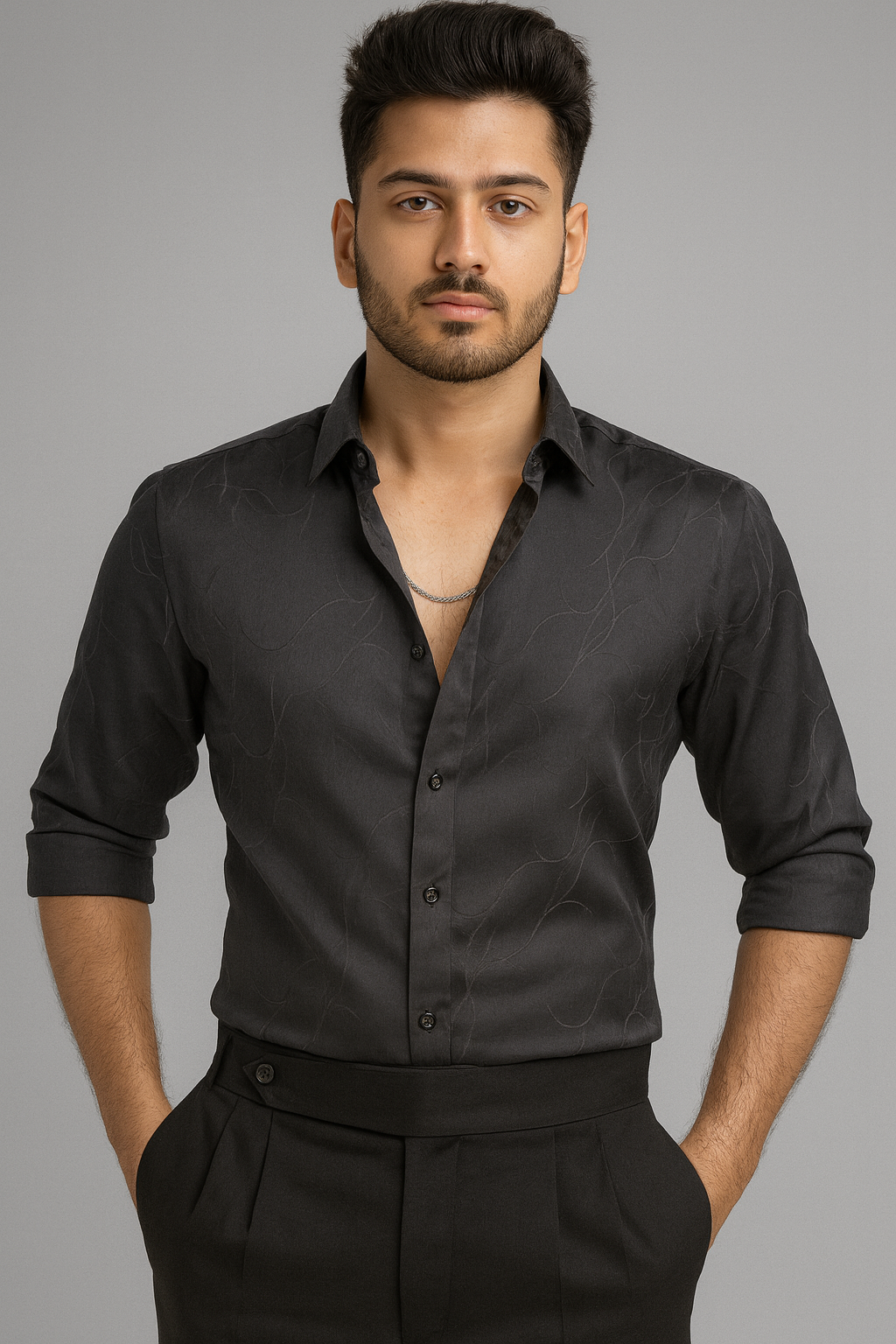 Designed with precision, the shirt features a modern slim fit that contours the shoulders and chest for a sharp silhouette. The soft rolled sleeves and slightly open collar give it a relaxed yet confident edge — perfect for evening outings, festive occasions, or premium casual wear.
