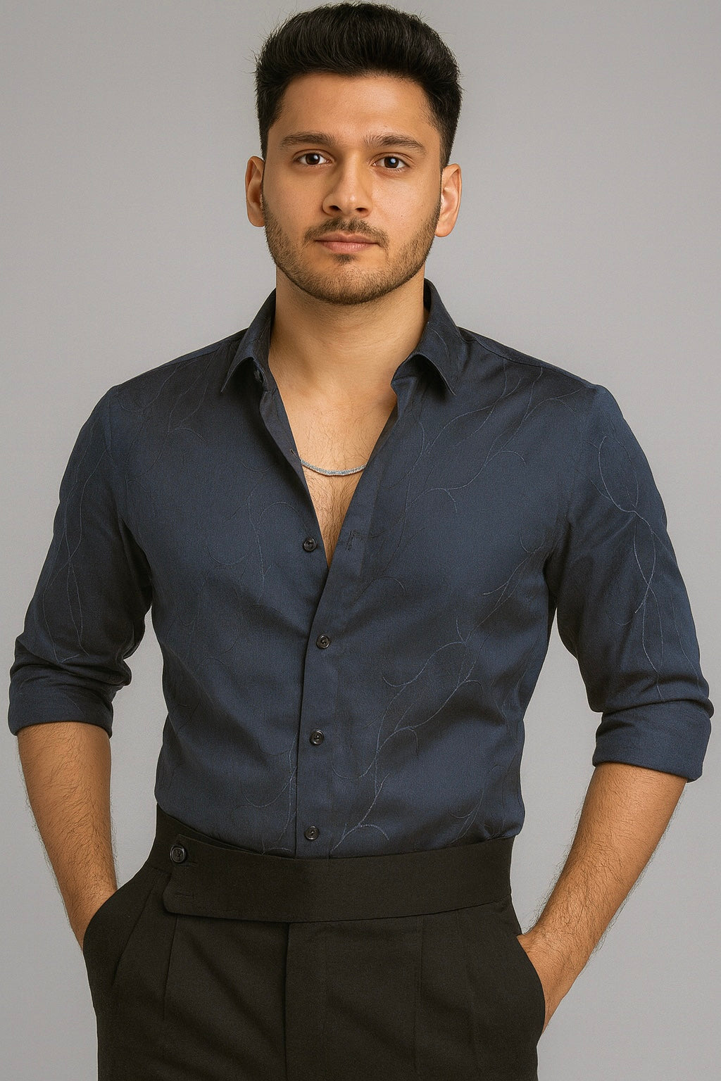 Designed with precision, the shirt features a modern slim fit that contours the shoulders and chest for a sharp silhouette. The soft rolled sleeves and slightly open collar give it a relaxed yet confident edge — perfect for evening outings, festive occasions, or premium casual wear.